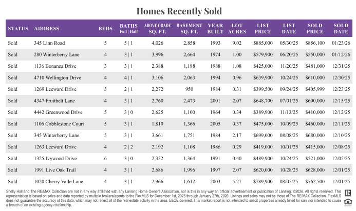 As of January 30, 2026, here’s the latest update on our local real estate market for Okemos, Haslett, and Williamston MI, including a full list of recently sold homes and properties in the area. Take a look at current trends, pricing, and neighborhood activity to stay informed on what’s happening in our local housing market.