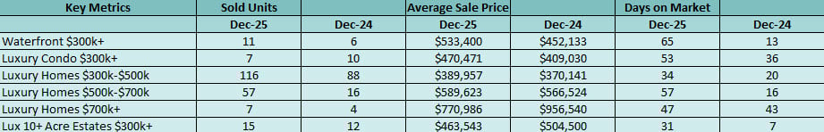 Closed sales for the Lansing area for luxury single family homes, condos, waterfront properties, and 10 plus acre estates priced at $300,000 and more were mixed year over year in December. Luxury condo sales above $300,000 decreased year over year by 30%, December 2025 (7) versus December 2024 (10). At the same time, luxury homes priced $300,000 to $500,000 also rose, December 2025 (116) versus December 2024 (88), showing continued buyer and seller activity around the $300,000 plus market.